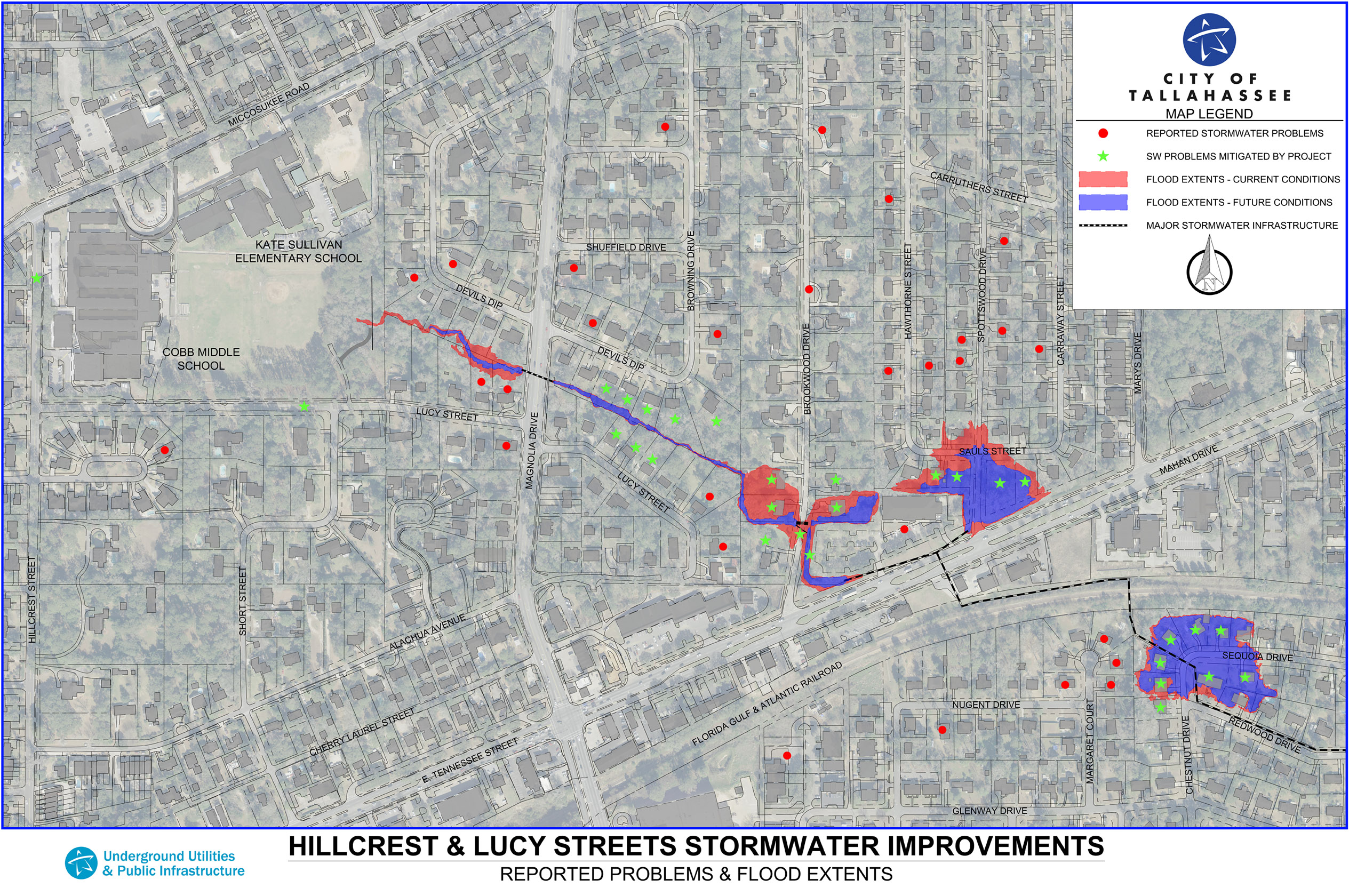 The City of Tallahassee is committed to reducing flooding, erosion and future property damage while improving safety in our community. Through the Hillcrest & Lucy Streets Stormwater Improvements Project, the City is addressing long-standing stormwater challenges in the Brockswood Park, Old Town, Brookwood Drive, and Inglewood neighborhoods.